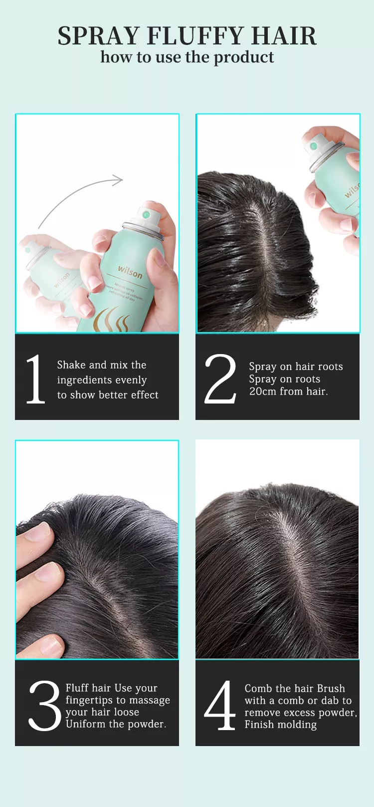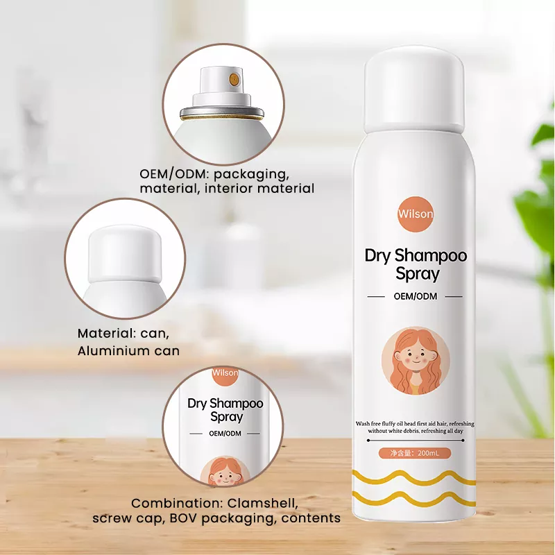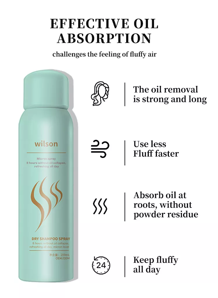 Spray de shampooing sec frais sans lavage instantané Wilson en ajoutant de la glycérine, des triglycérides, de la vitamine E, de la vitamine B5 et d'autres ingrédients de soins capillaires, de sorte que la nutrition et l'humidité des cheveux, pour combler les pellicules et les cheveux eux-mêmes manquent d'ingrédients, tout en complétant la couche d'huile capillaire, réparer l'usure des cheveux endommagés, protéger la tête de l'environnement extérieur et enfin atteindre l'objectif de restaurer des cheveux sains.