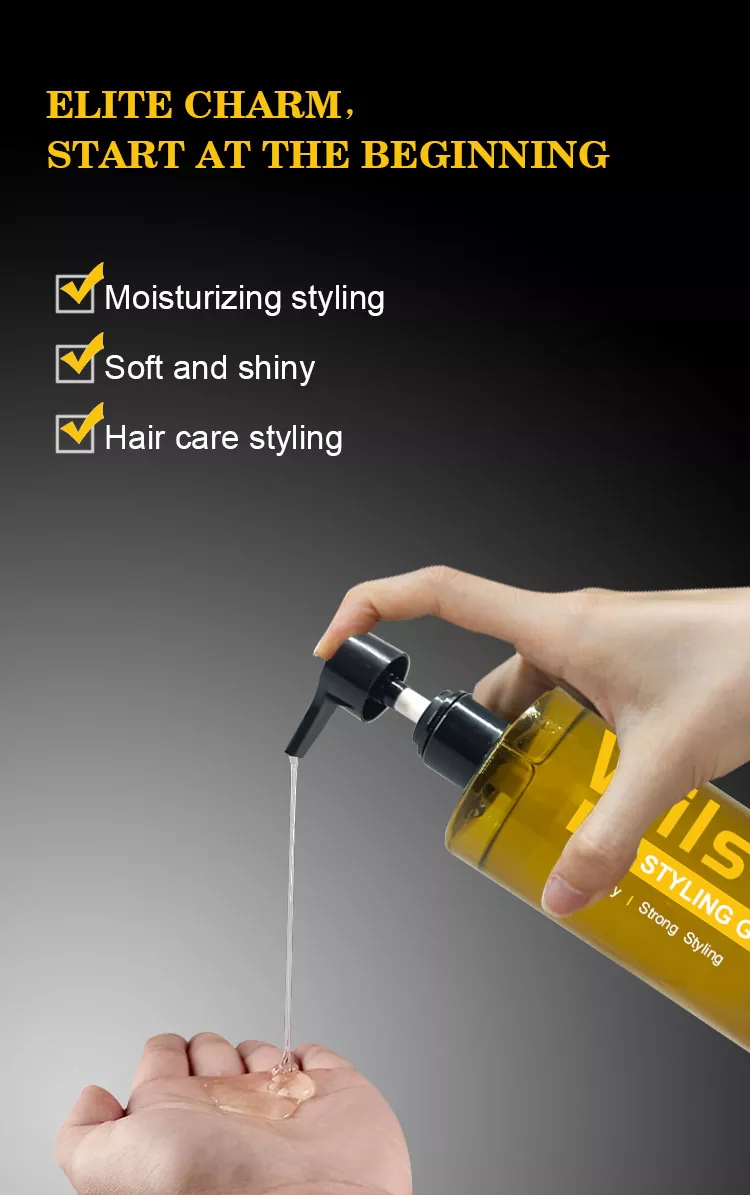 Le gel coiffant Ultra Smooth Seamless pour hommes de Wilson fait référence à l'effet coiffant et modificateur des cosmétiques, pulvérisé ou appliqué sur les cheveux, à l'évaporation du solvant et au séchage sur les cheveux pour former un film transparent, de sorte que la fibre capillaire durcisse et maintienne la forme afin de répondre aux besoins de diverses coiffures.