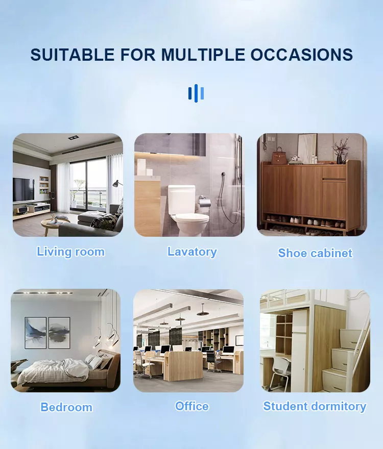 est un produit spécialement conçu pour améliorer la qualité de l’air intérieur. Il peut améliorer les odeurs intérieures, le formaldéhyde, les PM2,5 et d'autres substances nocives, afin que vous respiriez un air plus pur et plus frais. Les assainisseurs d’air conviennent aux scénarios suivants :
