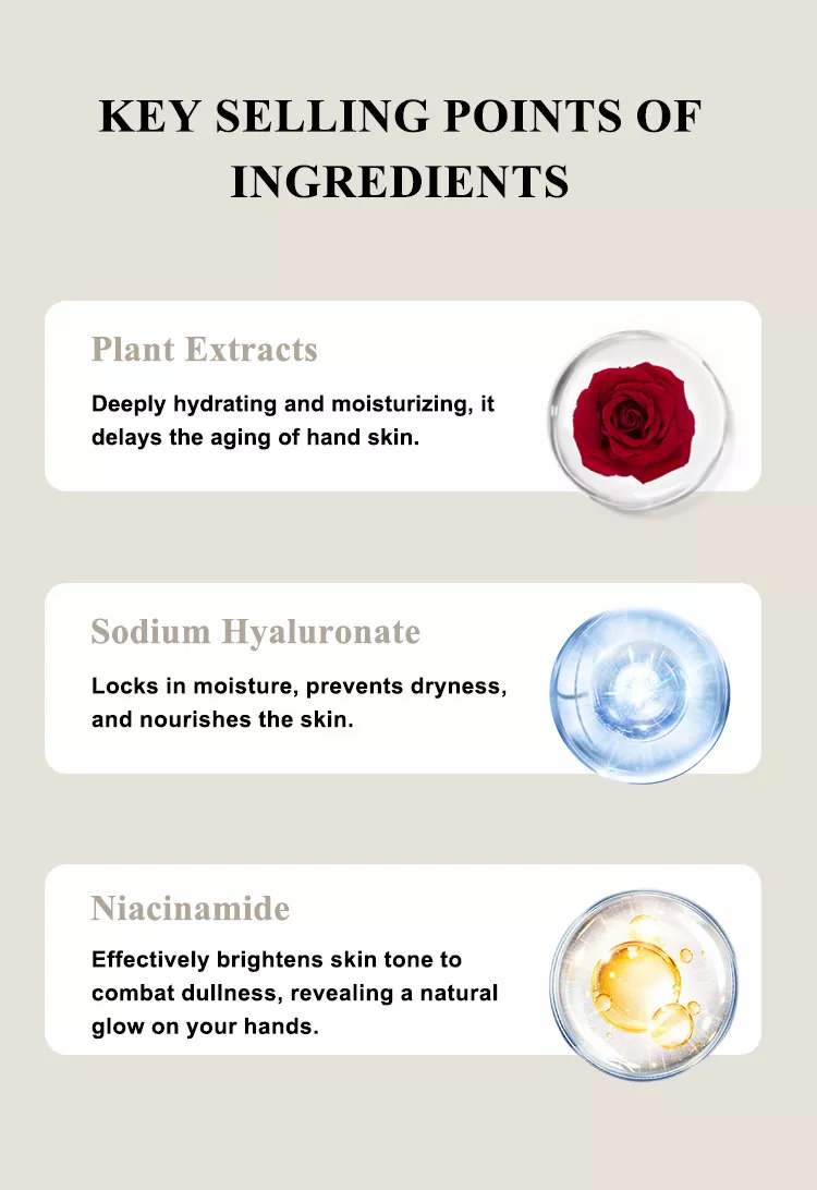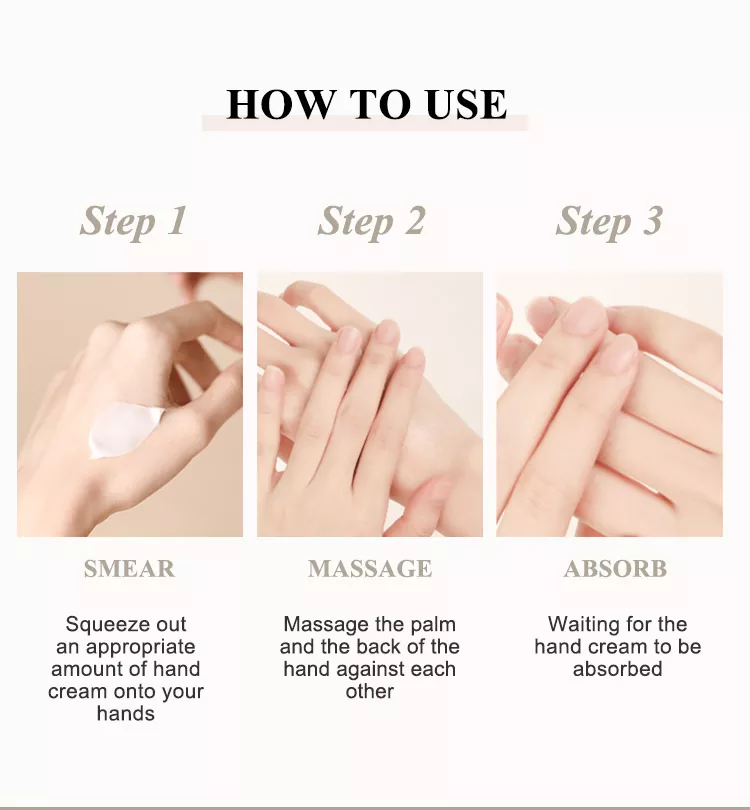 Après avoir utilisé la crème pour les mains à soulagement immédiat à absorption rapide, la peau devient plus délicate, les ridules sont réduites et la teneur en eau de la peau est augmentée. La crème pour les mains convient à diverses occasions de la vie quotidienne, en particulier pour ceux qui se lavent fréquemment les mains, entrent en contact avec des produits de nettoyage ou sont exposés à des environnements secs et froids. Que ce soit pour les soins à domicile, au bureau ou pour les activités de plein air, l'application opportune de la crème pour les mains protège efficacement vos mains et maintient une peau saine et jeune.